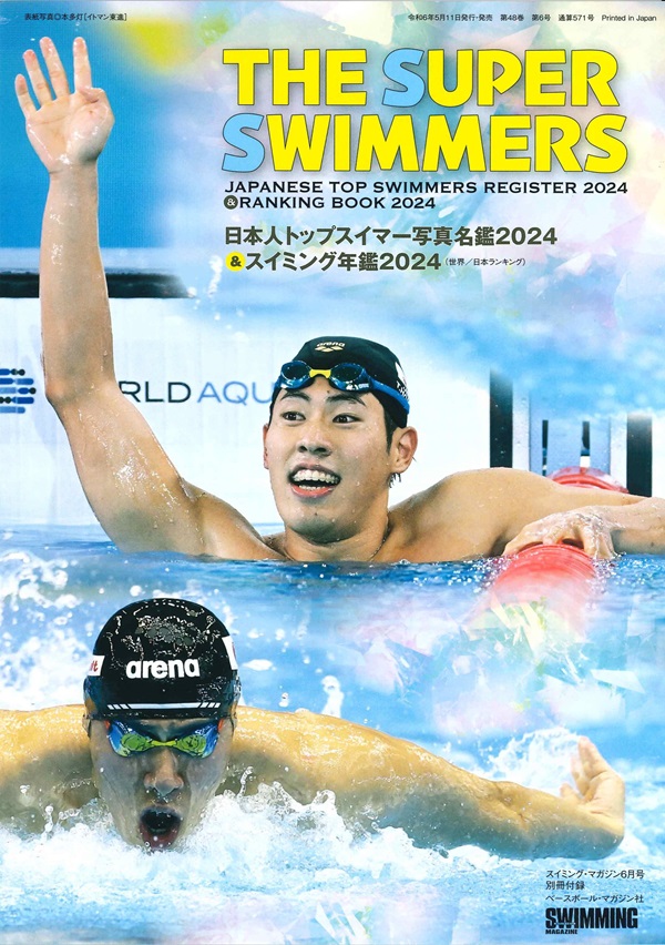 THE SUPER SWIMMERS 日本人トップスイマー写真名鑑&スイミング年鑑2024(世界日本ランキング) Road to Paris! パリ五輪代表特集 Special Interview 松下知之 [男子400m個人メドレー] 世界&日本『2強泳速データ対決』 パリ五輪戦士 「名言・笑言」コメント集 短期連載 名将インタビュー【前編】 鈴木陽二コーチ 入江陵介「引退」 The Technical Focus フベルト・コーシュ [ハンガリー] の背泳ぎ [春・新たな道へ] 松井浩亮 [ジュニア★春の2大特集] [1] トップジュニア 「飛躍への秘策」 [2] 学ぼう! 「日本大豊山高のスタート」 【大会&合宿レポート】 強豪高校3校合同合宿 [日本大豊山・中京大附中京・桃山学院】 東京六大学春季対抗 水球全日本ジュニア選手権 水球/全国JO杯春季 【スイマガ・セミナー】 超トップスイマーの練習メニュー [ジュニア特別編(5)]高校3校合同合宿 陸トレシピ 小泉圭介 [日水連医事委員] ドリルマニュアル 今井聡士 [セントラル横浜] 【連載】 ジュニアクローズアップ★平井瑞希 [アリーナつきみ野SC] 運動生理学 本多灯の「Light it UP! 僕のポジティブ水泳道)」 食べて速くなる栄養学 海外トップスイマー[アンジェリーナ・クラー(ドイツ)] ワールドトピックス スイマガ記録室 News & Information&今月の新記録 POOL SIDE 読者のページ 読者プレゼント Final Lap / 編集後記 定期購読&バックナンバー購入案内 [検定合格者] 日本水泳連盟 [認定会合格者] 日本スイミングクラブ協会 ※「チームフラッシュ」 「平井伯昌のコーチング MY VICTORY ROAD」「My Memorial Race」は休載します。