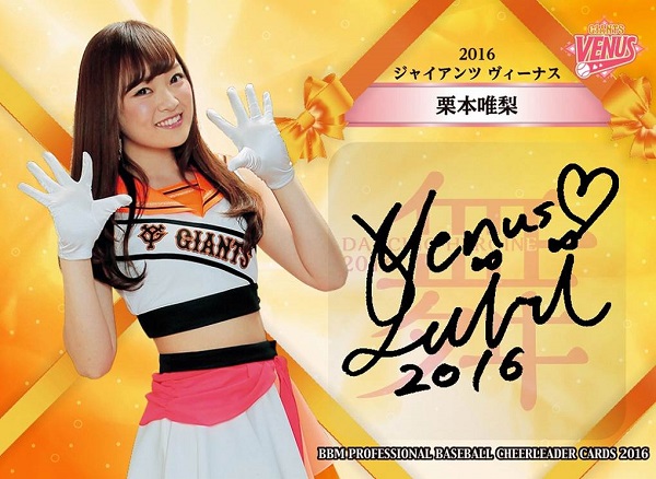 CONTENTSお待たせいたしました!毎年恒例のチアリーダーカード!! 恒例のチアリーダーカード、今年も「華」「舞」2回に分けてリリース。 後編「舞」は9球団87名のメンバーを収録予定。 直筆サインカードに加え、シリーズ初の「チェキ」も限定封入! ご予約はお早めに!! 全コレクション87種+α ◆レギュラーカード◆ □Honeys(福岡ソフトバンクホークス) 9種 □FIGHTERS GIRL(北海道日本ハムファイターズ) 11種 □M☆Splash!!(千葉ロッテマリーンズ) 13種 □bluelegends(埼玉西武ライオンズ) 8種 □東北ゴールデンエンジェルス(東北楽天ゴールデンイーグルス) 12種 □Passion(東京ヤクルトスワローズ) 7種 □2016 ジャイアンツ ヴィーナス(読売ジャイアンツ) 10種 □Tigers Girls(阪神タイガース) 9種 □チアドラゴンズ2016(中日ドラゴンズ) 8種 ※全種にホロパラレル版(ノンシリアル)があります。 ◆スペシャルインサートカード◆ □直筆サインカード(シール版) ?種 □チェキ ?種 ※直筆サインカードの裏面は証明書仕様になっています。 ※現在制作中のため、種類数等変更となる場合があります。 ※本商品には前編「華」後編「舞」とも、オリックス・バファローズの「BsGirls」 横浜DeNAベイスターズの「diana」は収録されていません。あらかじめご了承ください。